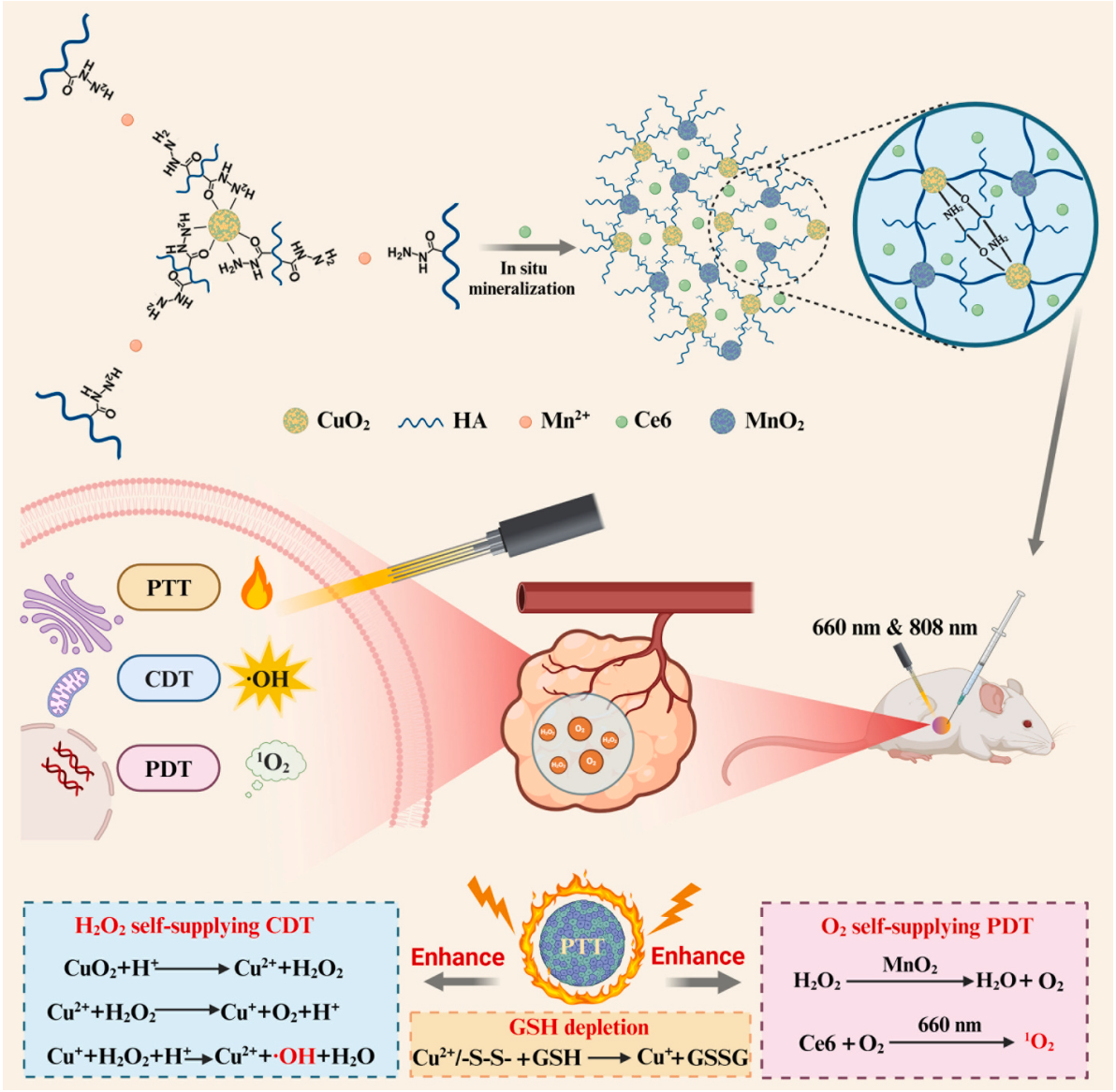 针对肿瘤组织乏氧、高氧化还原平衡状态等微环境特性,设计构建肿瘤局部适用的刺激响应性纳米载药系统,具有广阔的开发应用前景。本研究提出了一种新型矿化驱动的金属-酰肼配位交联方法用于构建治疗性透明质酸水凝胶,通过装载二氢卟吩(Ce6)等不同类型的药物,实施多元联合治疗。在小鼠乳腺癌模型瘤内注射后,弱酸性和高还原性肿瘤微环境在MnO2类过氧化氢纳米酶作用下触发CuO2纳米粒子分解产生Cu+、H2O2和O2,同时加速水凝胶降解和Ce6释放。生成的H2O2和O2分别显著增强了Cu+化学动力学疗法和Ce6介导的光动力疗法,从而引发强烈的活性氧(ROS,包括•OH和1O2)风暴。与此同时,CuO2纳米粒子、MnO2纳米粒子和二硫键共同消耗谷胱甘肽以避免ROS损耗。这为增强乳腺癌局部化学动力/光动力/光热三重疗法提供了四管齐下的ROS提升策略。