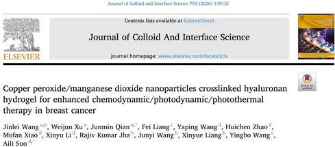 近日,我院西安肿瘤早诊创新转化重点实验室王金磊团队联合西安交通大学钱军民团队、西安交通大学第一附属医院锁爱莉团队在胶体与界面领域Top期刊《Journal of Colloid and Interface Science》(中科院1区Top, IF=9.7)上发表题为Copper peroxide/manganese dioxide nanoparticles crosslinked hyaluronan hydrogel for enhanced chemodynamic/photodynamic/photothermal therapy in breast cancer的最新研究论文,主要介绍了基于发现的金属-酰肼配位自组装现象,构建了具有丰富理化性质的CuO2/MnO2双交联的透明质酸纳米复合水凝胶,研究了其用于乳腺癌化学动力/光动力/光热联合治疗的效果及机制。