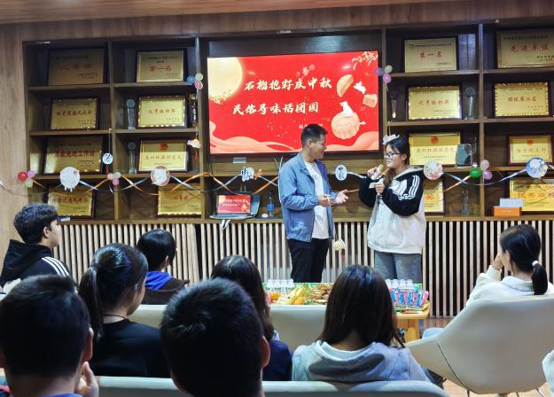 在主持人李轩皓有序组织下,活动顺利开展。灯谜环节,主持人手持灯谜逐一提问,各民族学生围聚共思共解,笑声与讨论声交织,织就中秋温馨序曲。随后玉米提江献唱《明月几时有》,台下轻声跟和,清亮婉转的歌声将中秋团圆的期盼与对民族大家庭的挚爱融入这满场温情之中。