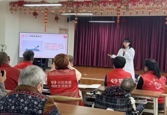 活动伊始,志愿者结合中老年群体的生理特征与日常场景,以通俗的语言讲解急救知识的重要性:“吃饭时呛咳、突发晕厥等情况在生活中并不少见,正确的急救方法能帮我们在等待医护人员的间隙,为自己或身边人‘抢时间’。”随后,宣讲内容聚焦两大核心急救技能展开:一是心肺复苏术(CPR),志愿者从判断意识、呼叫救援、调整体位等准备工作讲起,逐步拆解胸外按压的深度、频率及开放气道的正确姿势,特别强调“针对老年人骨骼特点,按压时需控制力度,避免二次伤害”;二是中老年人专属海姆立克急救法,志愿者详细讲解站姿、坐姿两种急救操作,还通过“石头剪刀布”的口诀,帮助老人们快速记忆