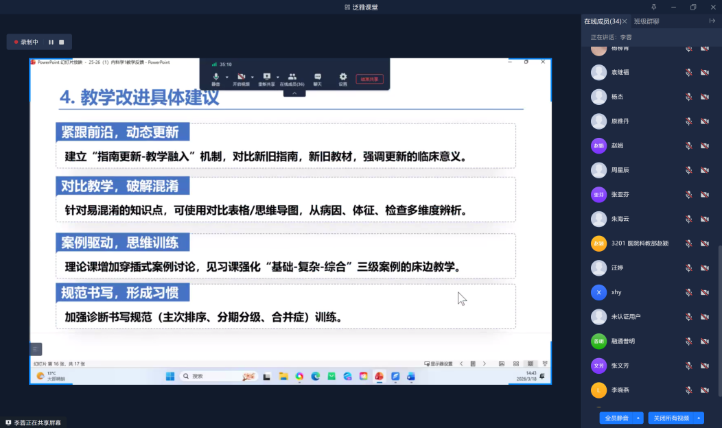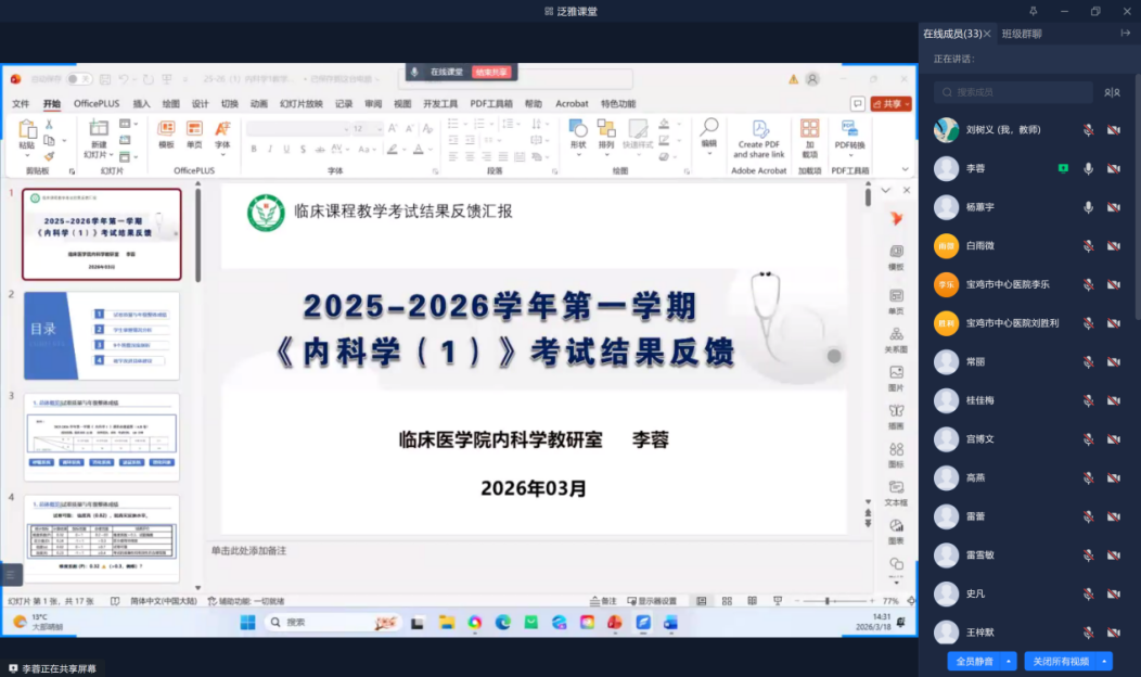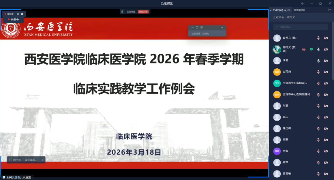 为进一步贯彻落实《西安医学院执业医师资格考试通过率提升三年行动工作实施方案》要求,加强学院与各教学医院协同育人机制,规范临床实践教学管理, 3月18日下午,临床医学院组织召开了2026年春季学期线上临床实践教学工作例会。临床医学院院长严喜章、21所教学医院与实习基地教学分管领导及教学管理人员参会。会议围绕教学复盘、任务部署、问题协调与经验交流等内容展开,旨在确保新学期临床教学工作的有序实施。会议由临床医学院副院长杨蕙宇主持。